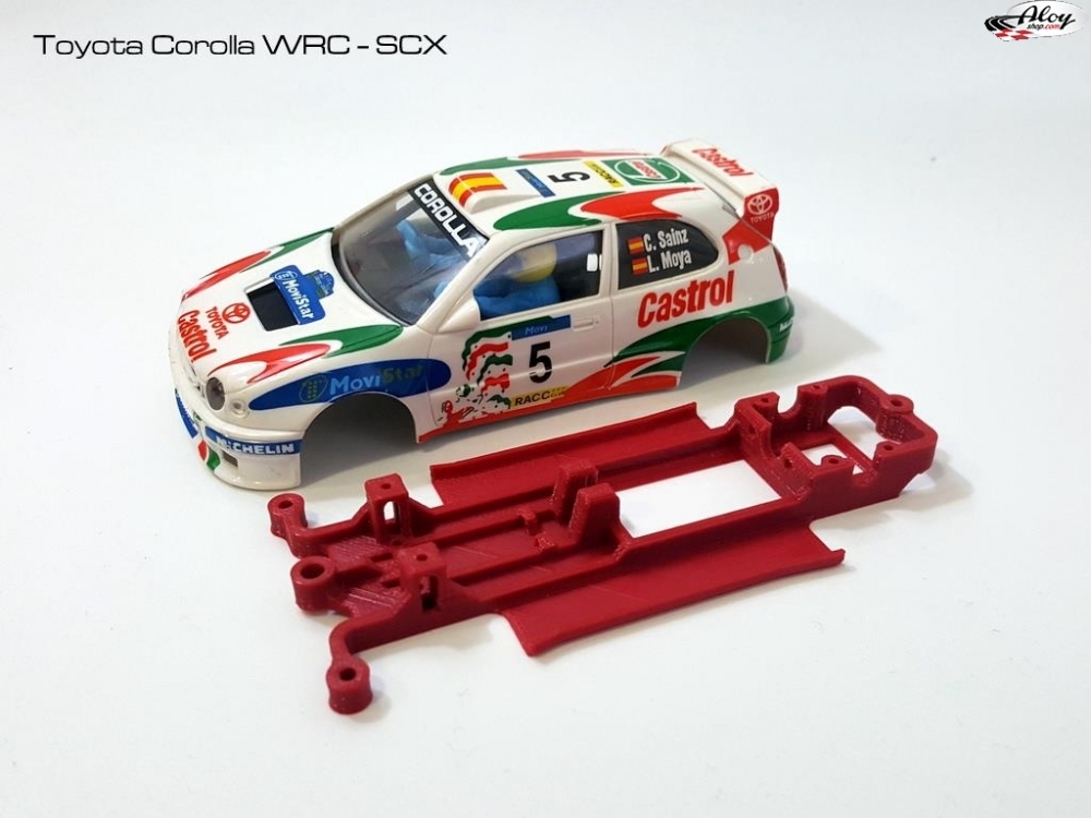 Con soporte de motor integrado, compatible con motores de caja larga y con mejoras sobre el chasis convencional del Toyota Corolla WRC de SCX: